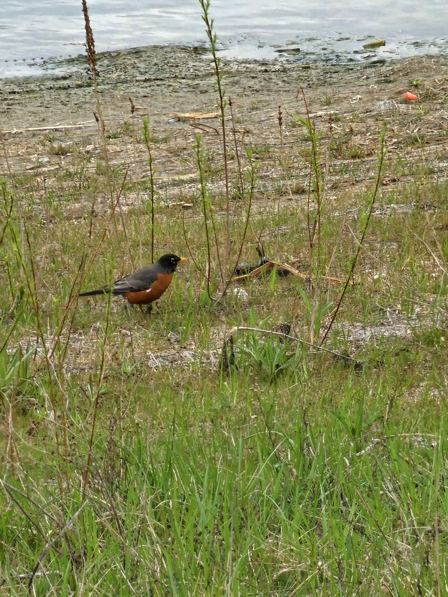 American Robin, 미국 지빠귀 미국 지빠귀, 갈색의 가슴털이 특징입니다. 정말 흔하게 볼 수 있습니다.